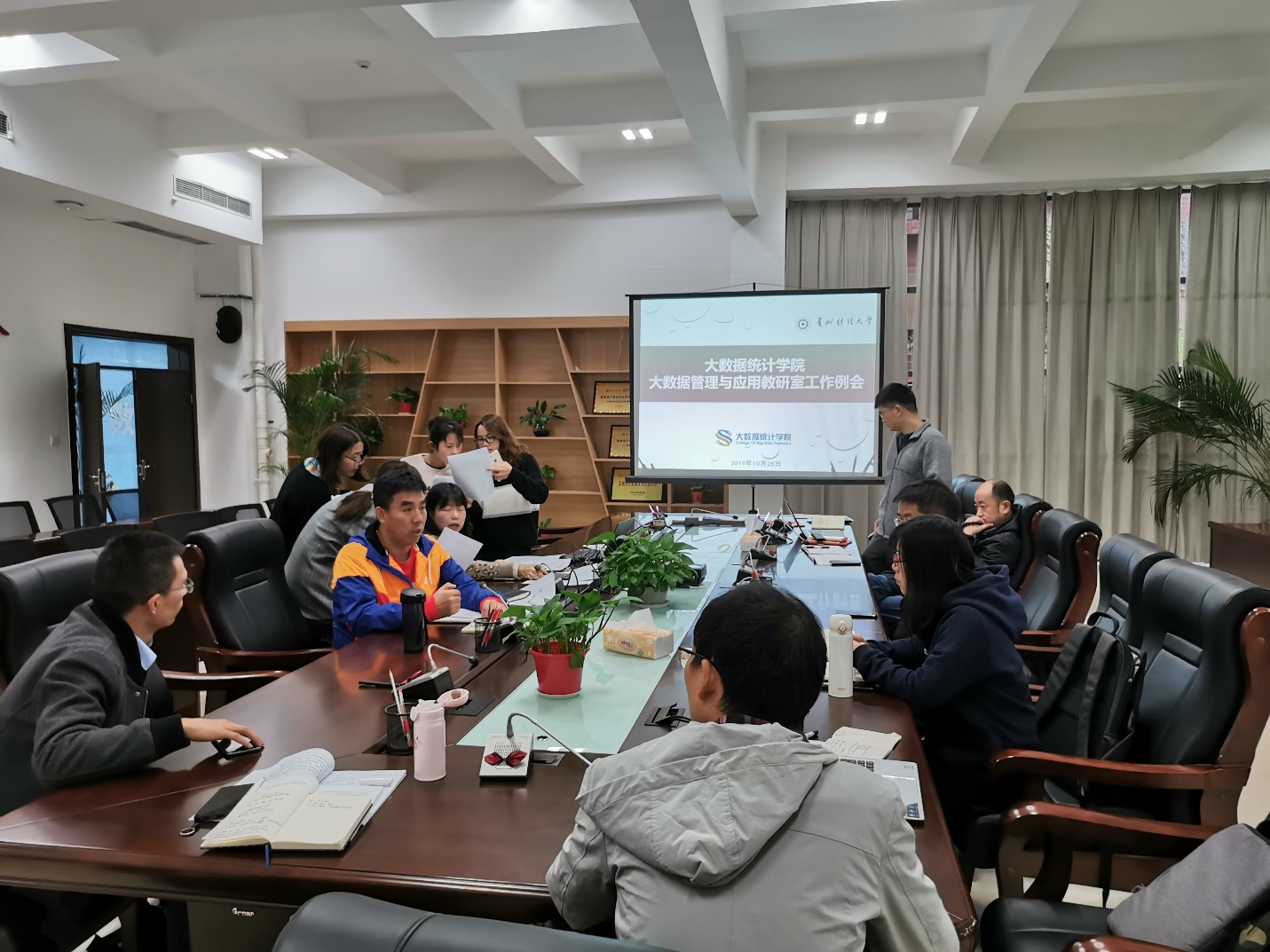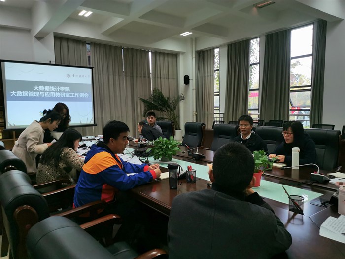 2019年10月25日上午,大数据统计学院大数据管理与应用教研室工作例会在修德楼107会议室召开。学院教务科负责人及所有专任教师参加了本次会议。会议由副院长于桂海主持。