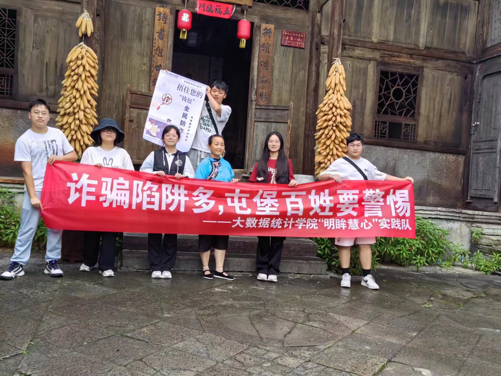 活动期间, "数"说屯堡探索队深入本寨村,通过实地走访调研,深入了解了屯堡文化的独特建筑、饮食和服饰。他们将学院的文化传承品牌活动——数说系列活动走出校园,在本寨村开展了"非遗之品味古风遗韵屯堡文化"活动。活动现场,12份作品通过可视化技术生动展示了屯堡文化的独特魅力,让村民们和游客们感受到了数据与非遗文化相结合的新颖体验。学生们还通过相声的形式,展示了他们对屯堡文化的认知与理解。 "明眸慧心"实践队精心制作并发放了防诈骗和禁毒宣传单,同时,通过生动的小品表演,向村民展示了防诈禁毒的典型案例。