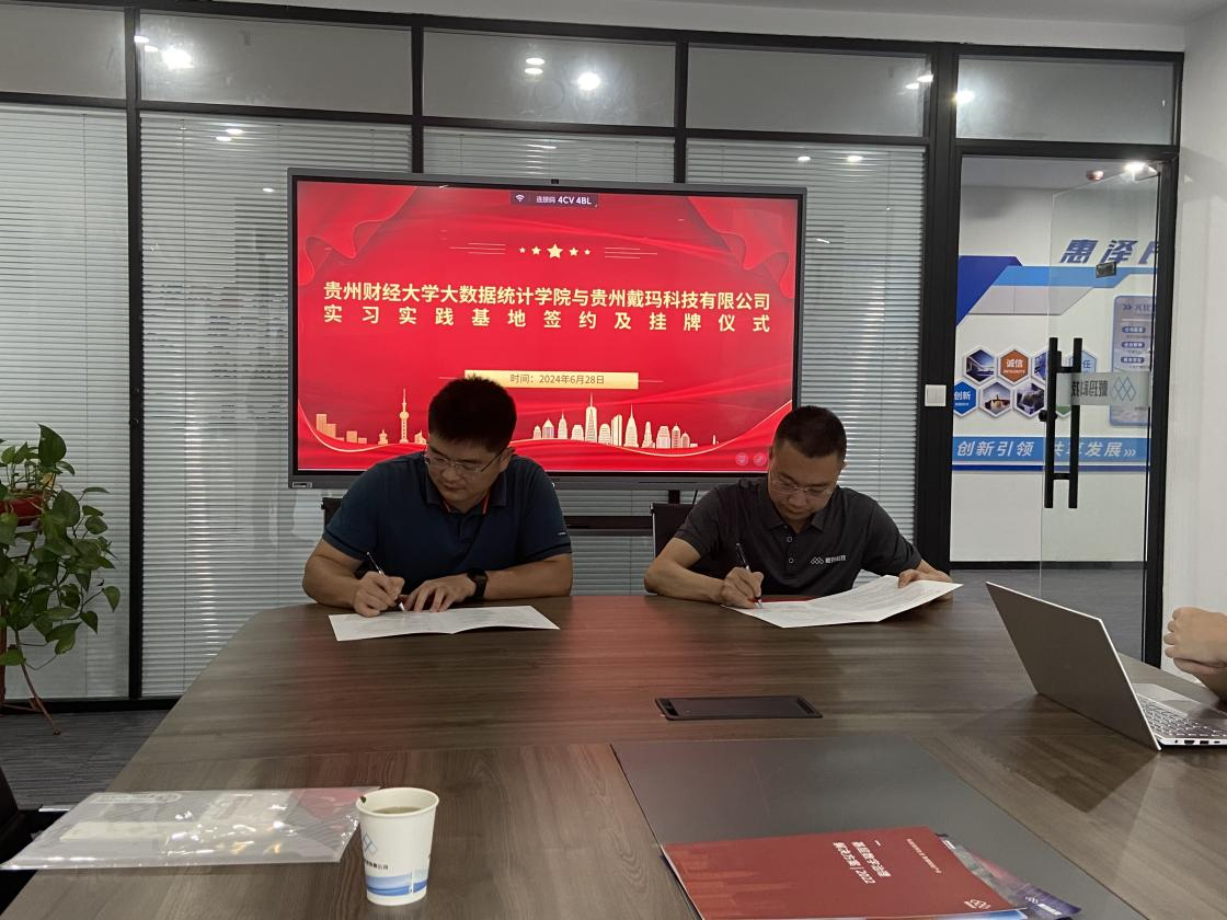 6月28日下午,大数据统计学院正处级专职组织员陈波、副院长胡杰带队前往贵州戴玛科技有限公司,在贵阳市双龙航空港经济区龙水路一树大厦4楼会议室举行了实习实践基地签约仪式,并成功挂牌“贵州财经大学大数据统计学院校外实践教学基地”。