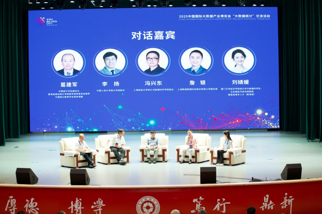 第二个环节为圆桌对话。中国统计学会副会长、教育部高校统计学类教学指导委员会委员、中国统计教育学会常务理事葛建军,中国人民大学统计学院院长李扬,上海财经大学统计与数据科学学院院长冯兴东,上海数喆数据科技股份有限公司副总裁詹银围绕“人工智能时代的统计教育变革与高阶复合型统计人才培养”开展对话,国家级青年人才(教育部)刘婧媛主持活动。