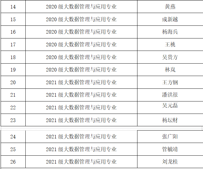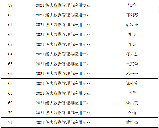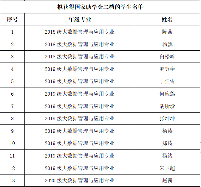 根据《贵州财经大学国家助学金实施管理办法》文件精神,结合《大数据统计学院2021—2022学年国家助学金评选细则》,学院本着公平、公开、公正的原则开展了2021—2022学年国家助学金的评选工作,现评选工作已经结束,将评选结果进行公示: