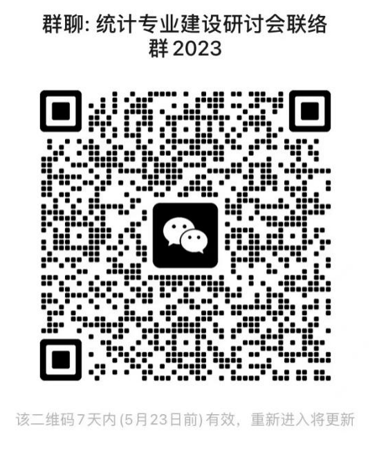为方便会议期间大家交流研讨及相关会议信息发布,辛苦参会人员扫描以下二维码,加入“统计专业建设研讨会联络群2023”微信群,进群后以“单位-姓名”形式修改群昵称。