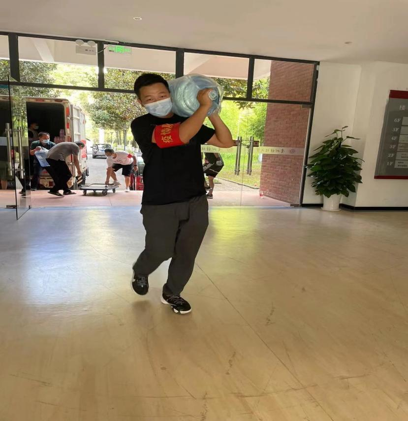 作为从四川独自入黔工作的博士陈涛老师,在得知学校临时招募男老师负责物资的卸货与转运进学校的消息时,主动报名,成为第一批后勤志愿者,变身“物资搬运工”,积极投入到疫情防控学校将近两万人的饮用水的卸货中。最初,志愿者人手不足,每天搬水最少4个小时,有时夜里凌晨12点多还在卸货,每天最少700多桶,有时有1400多桶,后面志愿者多了,陈涛老师又主动承担起南二门如蔬菜、大米的卸货工作。面对如此强度的体力劳动,陈涛老师却笑着表示:“现在学校防控工作做的很好,我虽然是群众,但保障了全校的饮用水,很有战斗力,很给力,疫情期间锻炼身体的机会不多,参加抗疫就是一种锻炼,我可不能错过。”