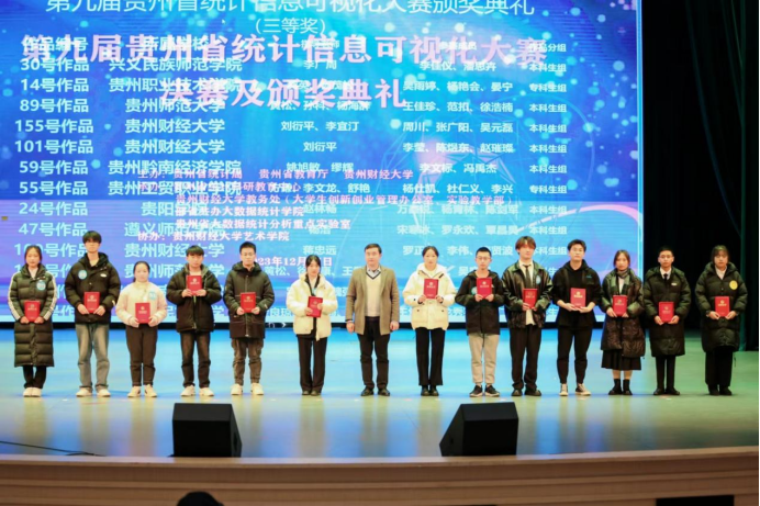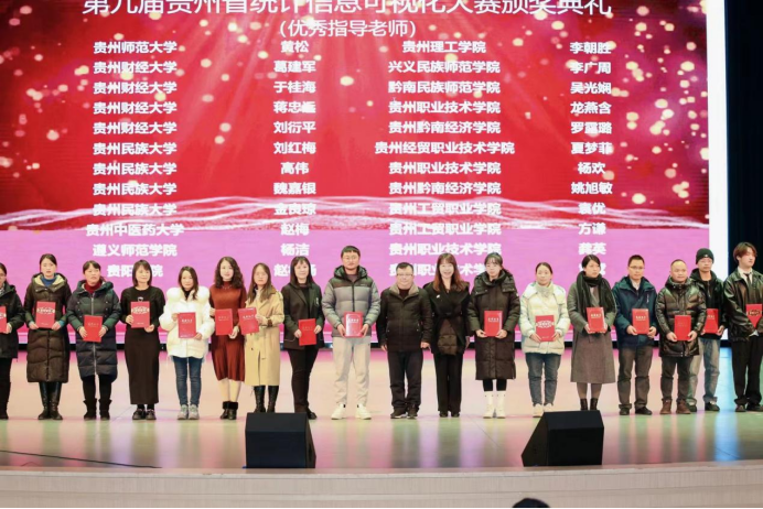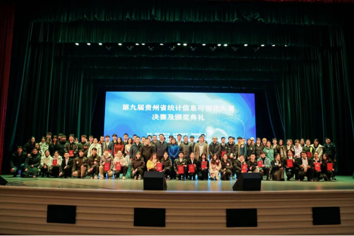 12月17日,第九届贵州高校统计信息可视化大赛决赛暨颁奖典礼在贵州财经大学大礼堂举行。本届大赛由省统计局、省教育厅和我校共同主办,贵州省统计科研教育中心、贵州财经大学教务处(大学生创新创业管理办公室、实验教学部)、部省共办大数据统计学院、贵州省大数据统计分析重点实验室共同承办,贵州财经大学艺术学院协办。