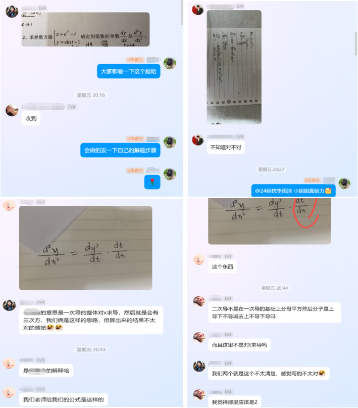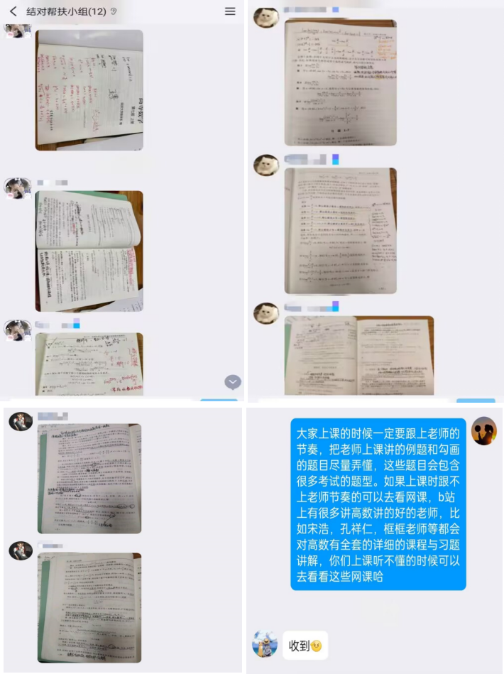 在帮扶学习中,同学们对有争议的题目进行线上提问,共同讨论解答,在答疑的过程中引发大家思考,提高团队的凝聚力,同时学长学姐们分别在讨论群中共享了自己的学习笔记,帮助低年级同学培养良好的学习习惯,以陪伴的方式,增强低年级同学学习的动力,减少他们对数学学习的恐惧和焦虑,同学们表示受益匪浅。