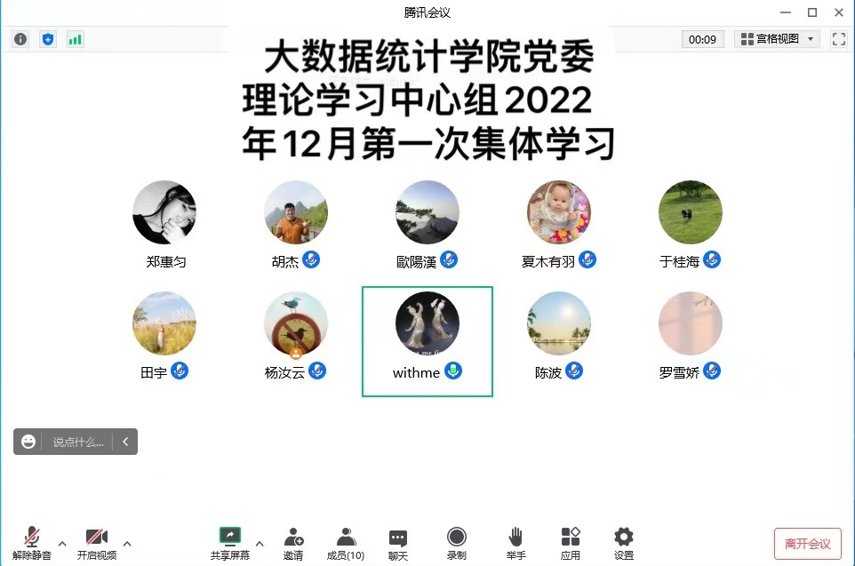 2022年12月15日,大数据统计学院党委理论学习中心组在线上举行。学院全体党委委员及科级干部参加,会议由大数据统计学院党委书记鲁静芳同志主持。