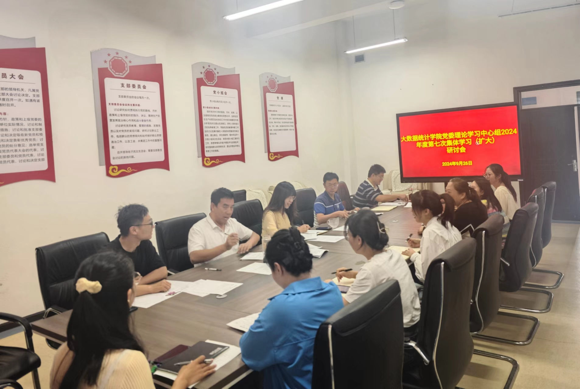 9月26日,大数据统计学院在修德楼206会议室召开党委理论学习中心组2024年度第七次集体学习(扩大)研讨会。学院全体党委委员参加学习研讨,各科室负责人列席会议,会议由党委书记鲁静芳主持。