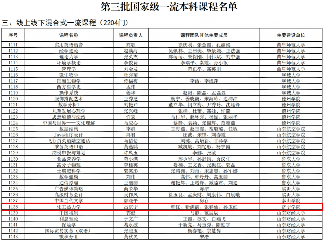 12月17日,教育部公布第三批国家级一流本科课程认定结果,我校吕京宁、韩红教学团队负责的《化工热力学》课程成功入选,获批线上线下混合式国家级一流本科课程。此次入选实现了我校国家级一流本科课程的突破,标志着学校课程建设取得里程碑式进展。