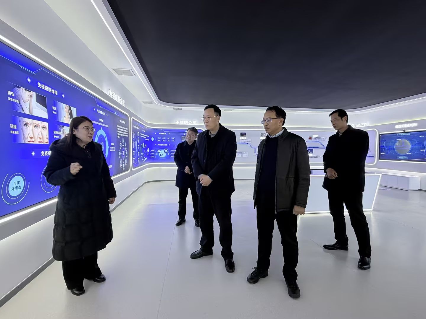 李凡路一行在赛恩福公司董事长兼总经理邓长江、副总经理尚现岗、陈莉的陪同下,首先参观了公司一楼的生命科学馆。通过陈莉的专业讲解,调研团队详细了解了赛恩福在干细胞技术领域从基础研究到临床应用的完整产业链布局,对其在细胞存储、技术研发及成果转化方面取得的显著成就表示赞赏。随后,调研组深入企业研发实验室,实地考察了干细胞制备、质检等核心工艺流程,切身感受了企业严谨的质量管控体系和前沿的研发实力。