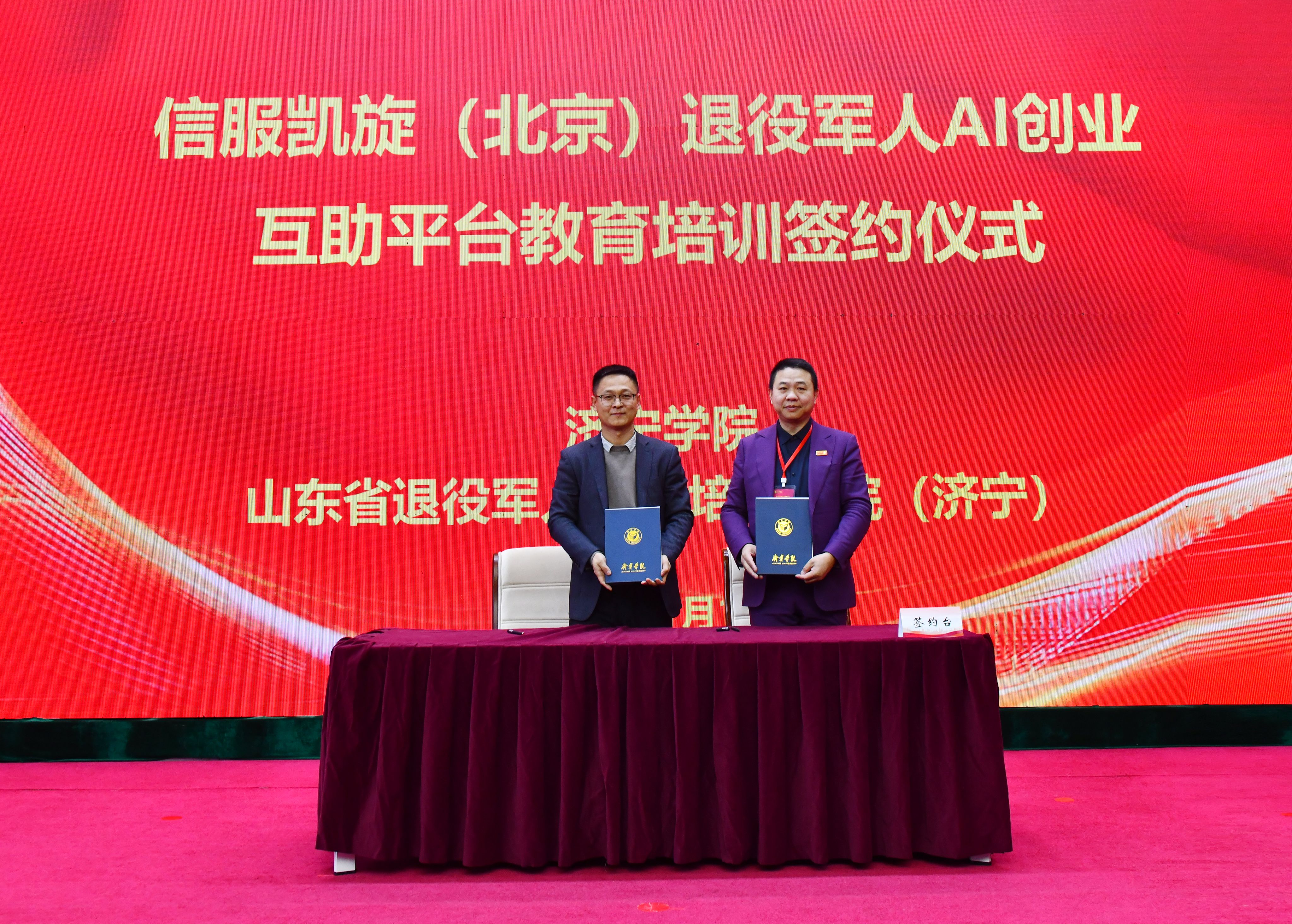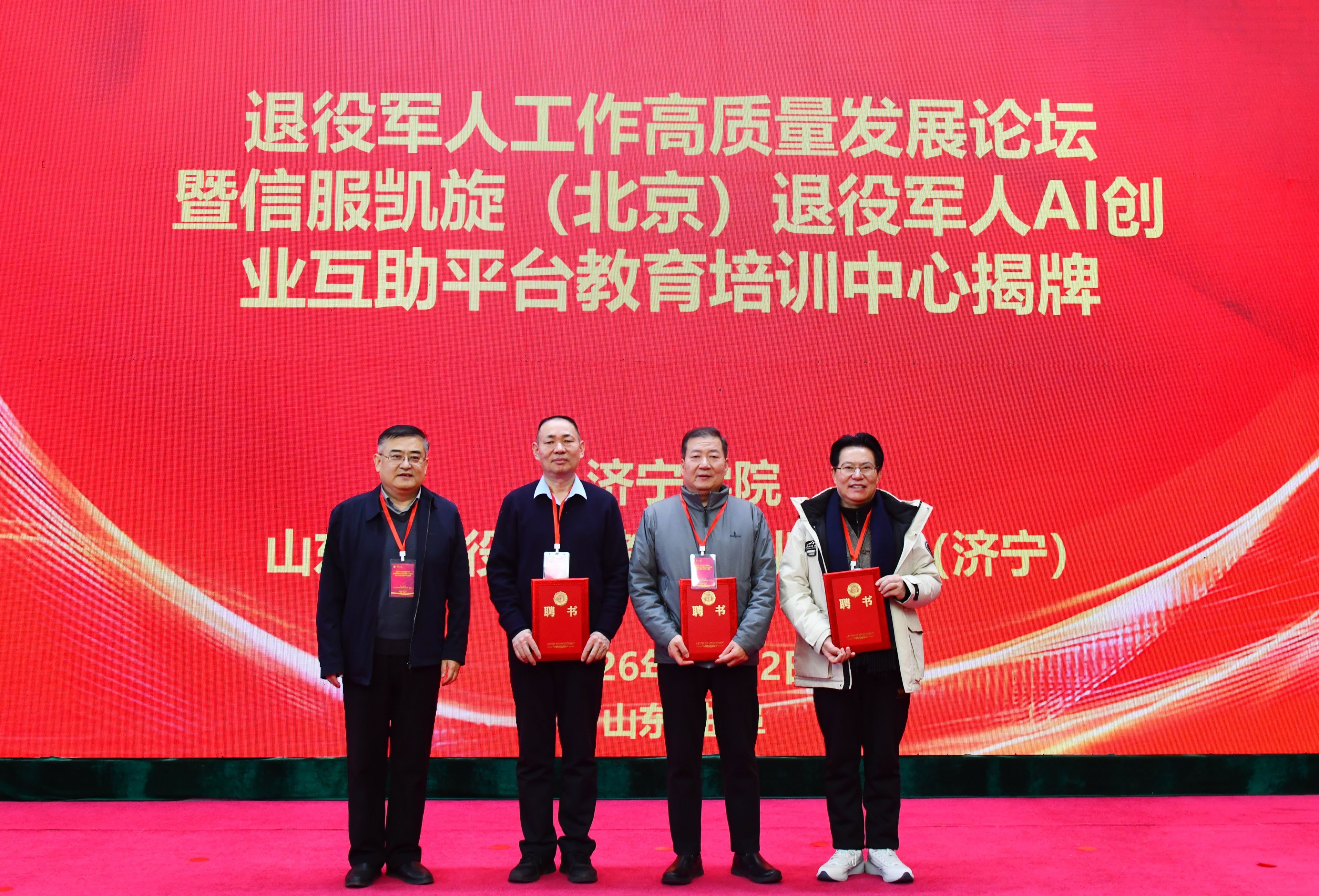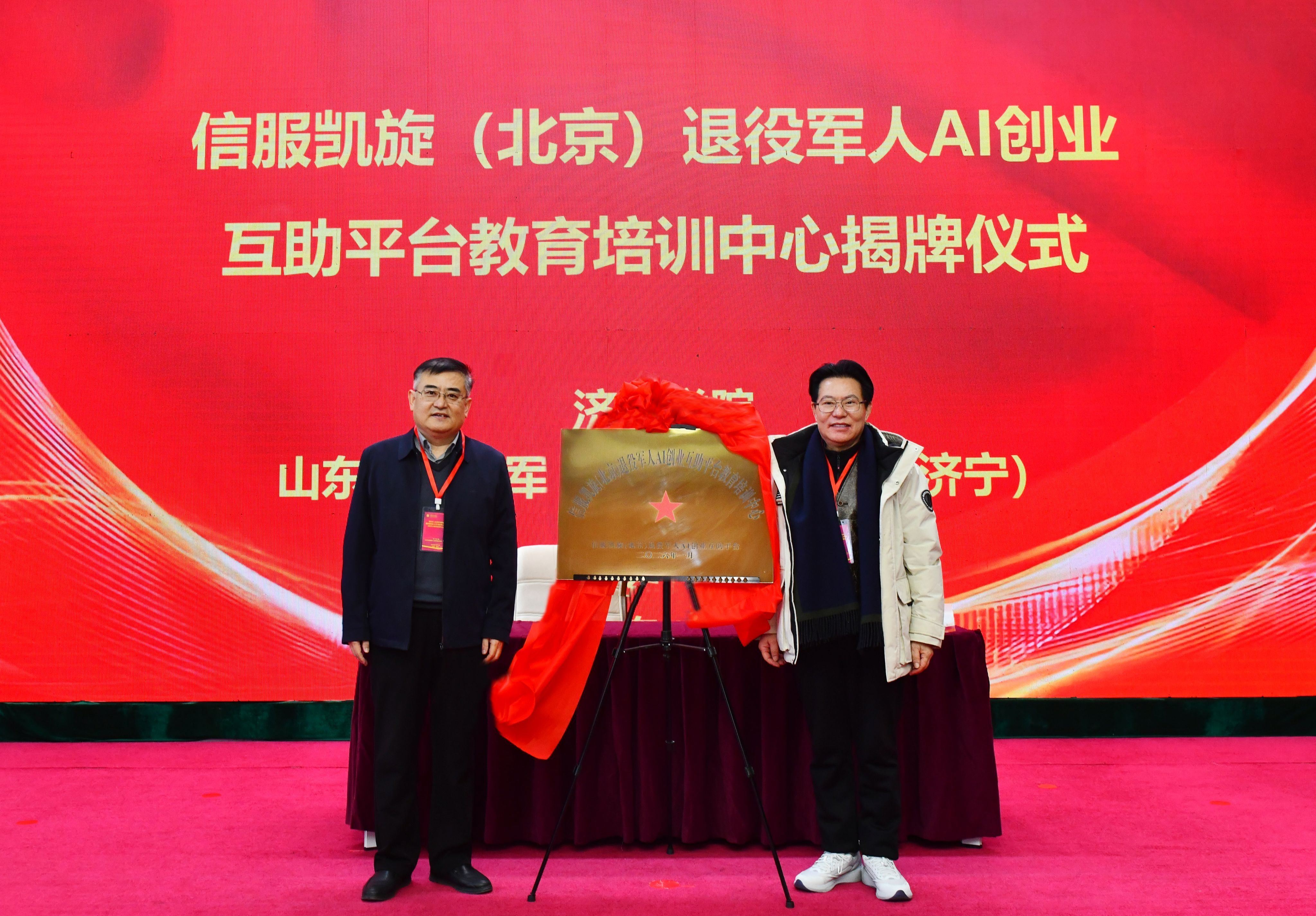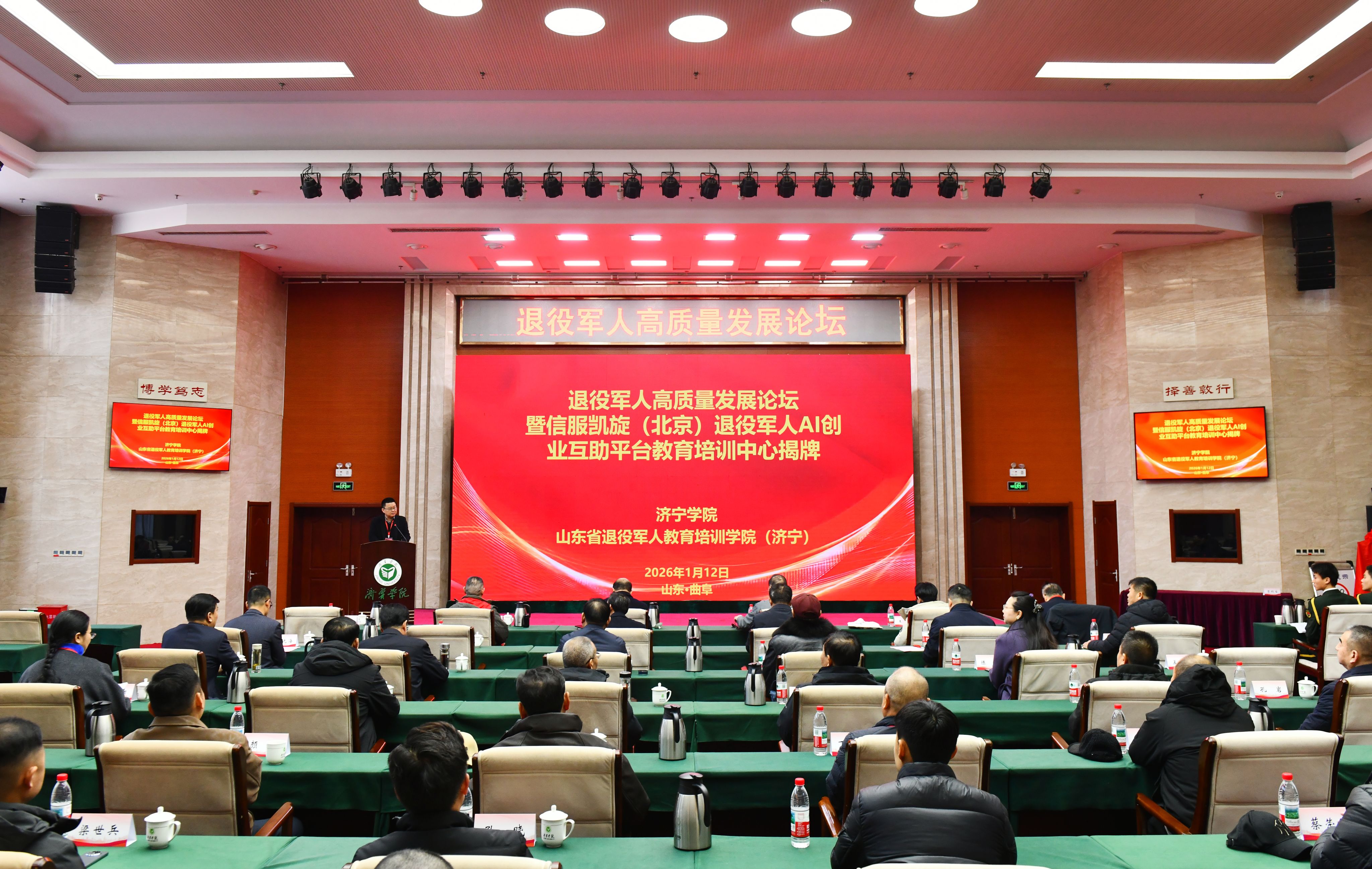 1月12日上午,我校在科技文化大楼报告厅举办退役军人工作高质量发展论坛暨信服凯旋(北京)退役军人AI互助服务平台教育培训中心揭牌仪式。济宁学院党委副书记丰家雷,军事战略专家、研究员、博导高东广,解放军新闻传播中心副军级主任编辑王世同,原38集团军装备部部长李怀胜,信服凯旋执行总裁、原雪豹突击队队员、退役军人创业战略发展导师田赣,山东省退役军人事务厅就业创业处一级调研员刘继涛,济宁市退役军人事务局党组成员、副局长吕成刚,曲阜市退役军人事务局党组书记、局长刘年,北京梦网云智算科技有限公司产学研发展事务部主任陈缘出席活动。自主择业军转干部联合会、军创企业联合协会、退役军人企业家及培训学员代表参加活动。活动由济宁学院副校长刘国栋主持。