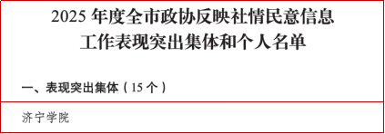 3月25日,政协济宁市委员会办公室发布《关于印发2025年度全市政协反映社情民意信息工作表现突出集体和个人名单的通知》。我校凭借在服务改革创新、关注社会民生方面的突出贡献,荣获“表现突出集体”,济宁市政协委员、民盟济宁学院支部主委、我校人文与传播学院教授赵双花荣获“表现突出个人”。