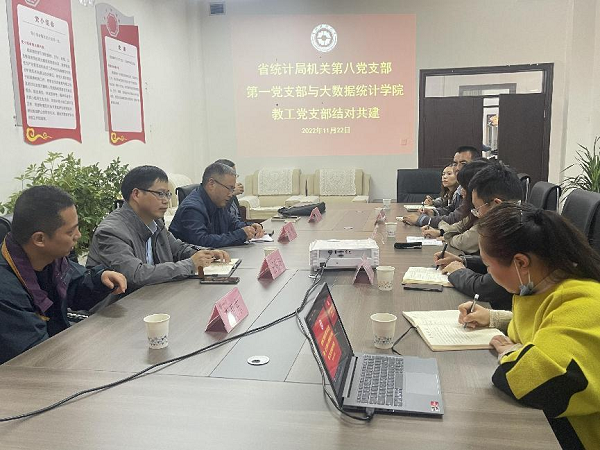 11月22日下午,省统计局机关第一党支部书记、国民经济核算处处长、生态价值统计处处长汪明峰、机关第八党支部书记、设管处处长刘旭带队赴大数据统计学院教工党支部开展结对共建交流座谈。省统计局大数据处处长吴江、大数据处一级调研员李贵东,大数据统计学院教工党支部书记鲁静芳、纪检委员陈波、副院长于桂海和教工党支部支委参加座谈。座谈由支部书记鲁静芳同志主持。