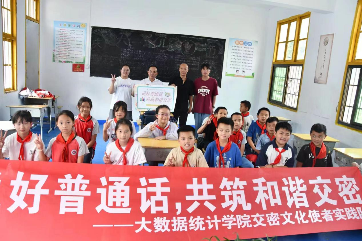 大数据统计学院大数据管理与应用系教工党支部和交密村党支部就支部结对共建进行了深入交流。大数据统计学院三下乡社会实践队伍——交密文化使者实践队在交密村小学开展了“说好普通话,共筑和谐交密”的普通话推广活动。大数据统计学院党委和审计处党支部联合筹集了上千元的生活物资和日用品,为交密村“三社联建 寨富驿点”村民积分超市补货上新。