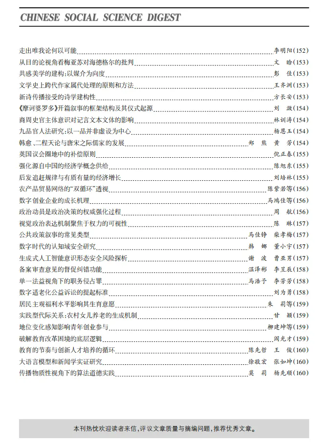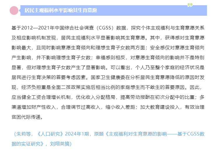 近日,我院朱莉副教授发表于《人口研究》2024年第1期的学术论文《主观福利对生育意愿的影响——基于CGSS数据的实证研究》被《中国社会科学文摘》2024年第7期论点摘要收录。