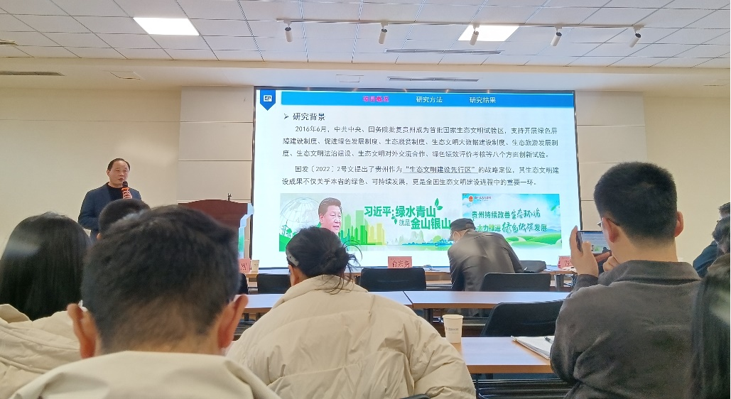 杨广斌教授作了题为“中国式现代化背景下贵州省生态文明建设水平测度及提升路径研究”的学术报告,对贵州省的生态文明建设状况进行了全面剖析。报告指出,2012年至2023年贵州省生态文明建设水平显著提升,但区域发展在市州层面和区县层面均存在不平衡现象。多维度分析显示,贵州省在森林覆盖率和污水处理方面取得了显著成效,但在能源利用效率、碳排放管控以及生态文化建设方面仍有较大差距,法规执行与治理体系也需要进一步完善。