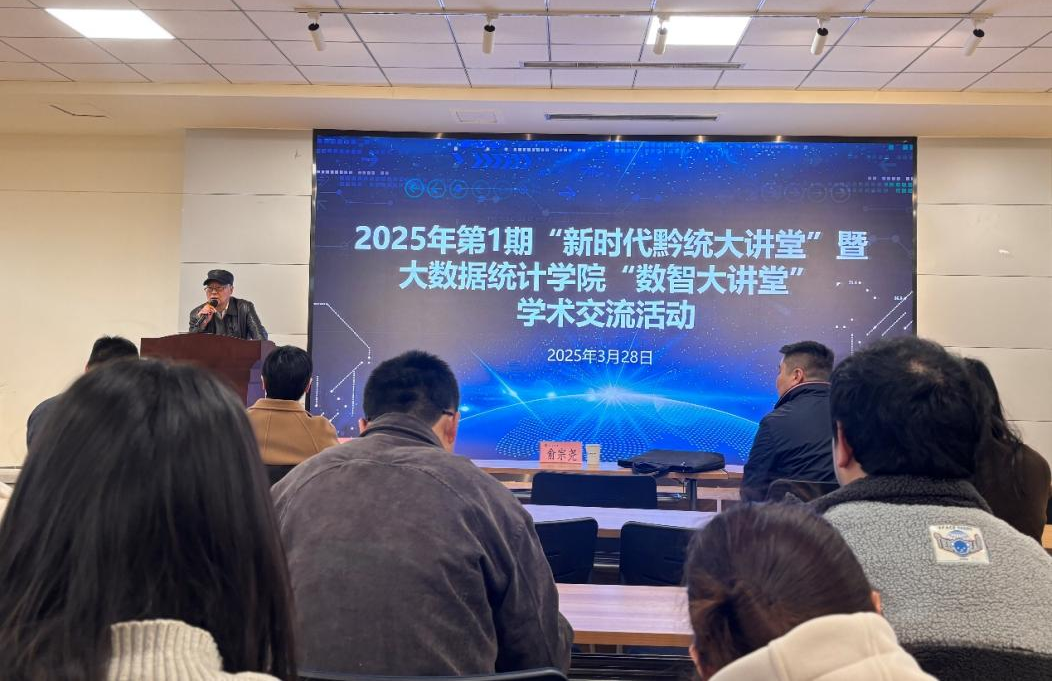 3月28日下午,省统计局2025年第1期“新时代黔统大讲堂”暨大数据统计学院“数智大讲堂”学术交流活动在修德楼218报告厅举行,活动邀请了贵州师范大学杨广斌教授,贵州财经大学毕秀春教授、李成刚教授作学术报告,贵州省统计学会学术委员会主任俞宗尧主持活动。