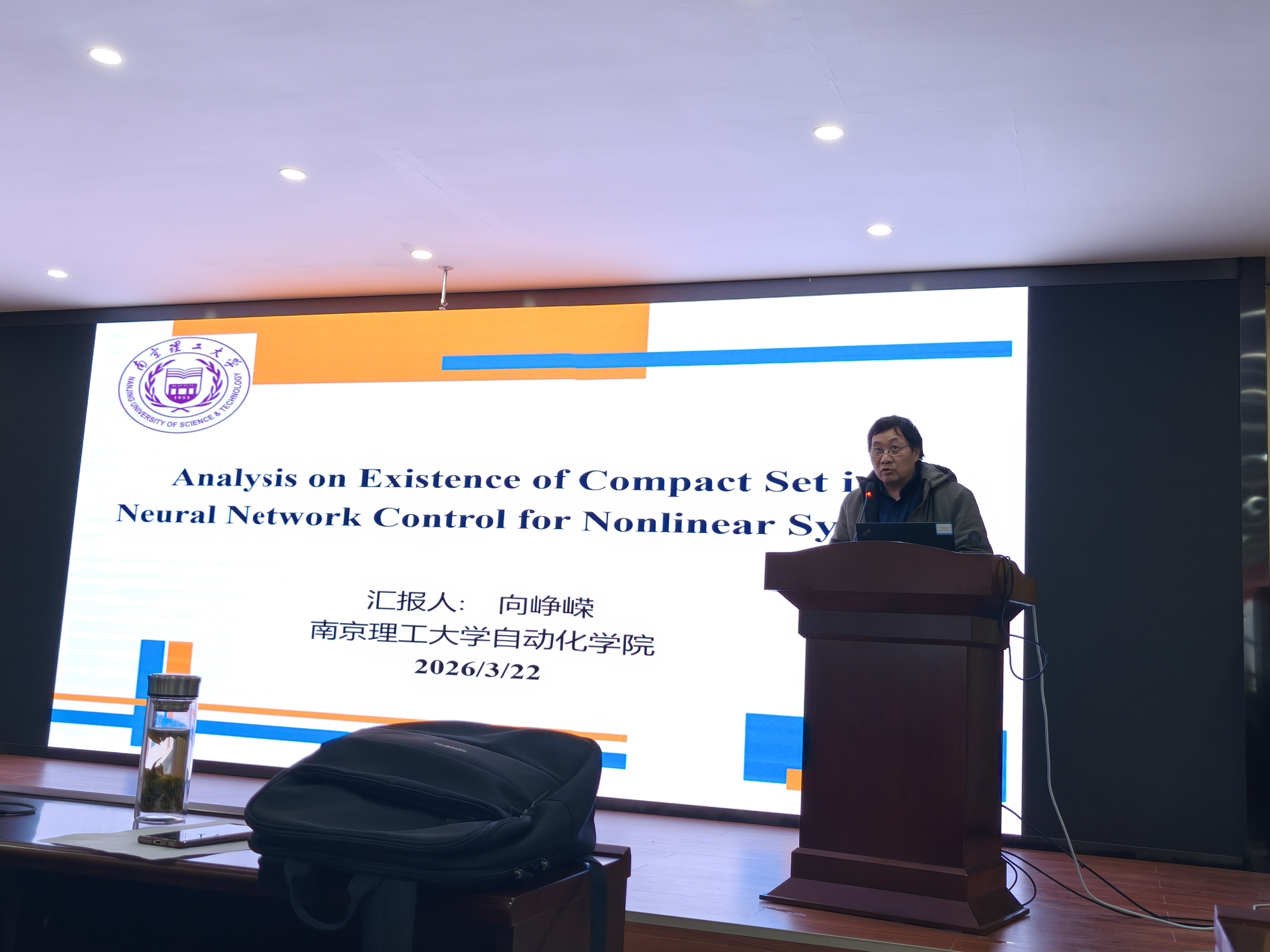 向峥嵘教授作了《关于非线性系统神经网络控制中紧集存在的性分析》的学术报告。该报告指出在非线性系统的控制器设计中,神经网络方法是逼近未知函数的有效工具。为了保证逼近的有效性,所逼近的未知函数的状态变量必须保持在紧集中。然而,在大多数已有的结果中,紧集的存在性并没有得到正确的证明。这就导致,现有研究关于紧集的证明实际上并不完整。本次报告分析了两种具有新颖神经网络控制器的典型非线性系统紧集的存在性,并给出了闭环系统半全局一致最终有界性的严格证明。
