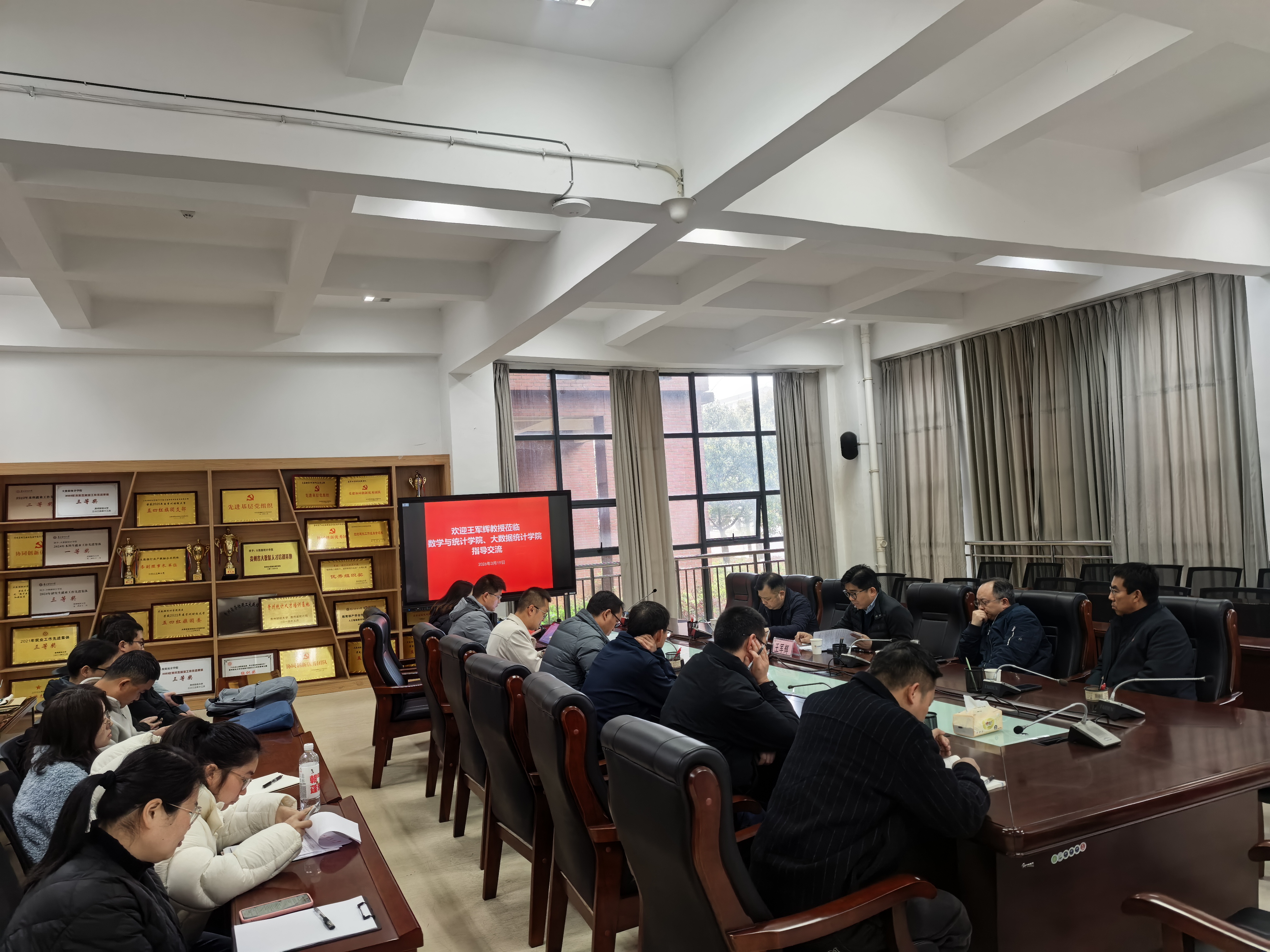 为进一步明确数据科学专业人才培养方向、持续夯实学科建设基础,3月19日上午,数学与统计学院、大数据统计学院在修德楼107会议室召开座谈会。会议邀请了香港中文大学统计及数据科学系教授、系主任王军辉教授亲临指导。会议由数学与统计学院院长、大数据统计学院院长张文专主持,信息学院党委书记于桂海、院长邓明森及我院数十名教师代表参加座谈。