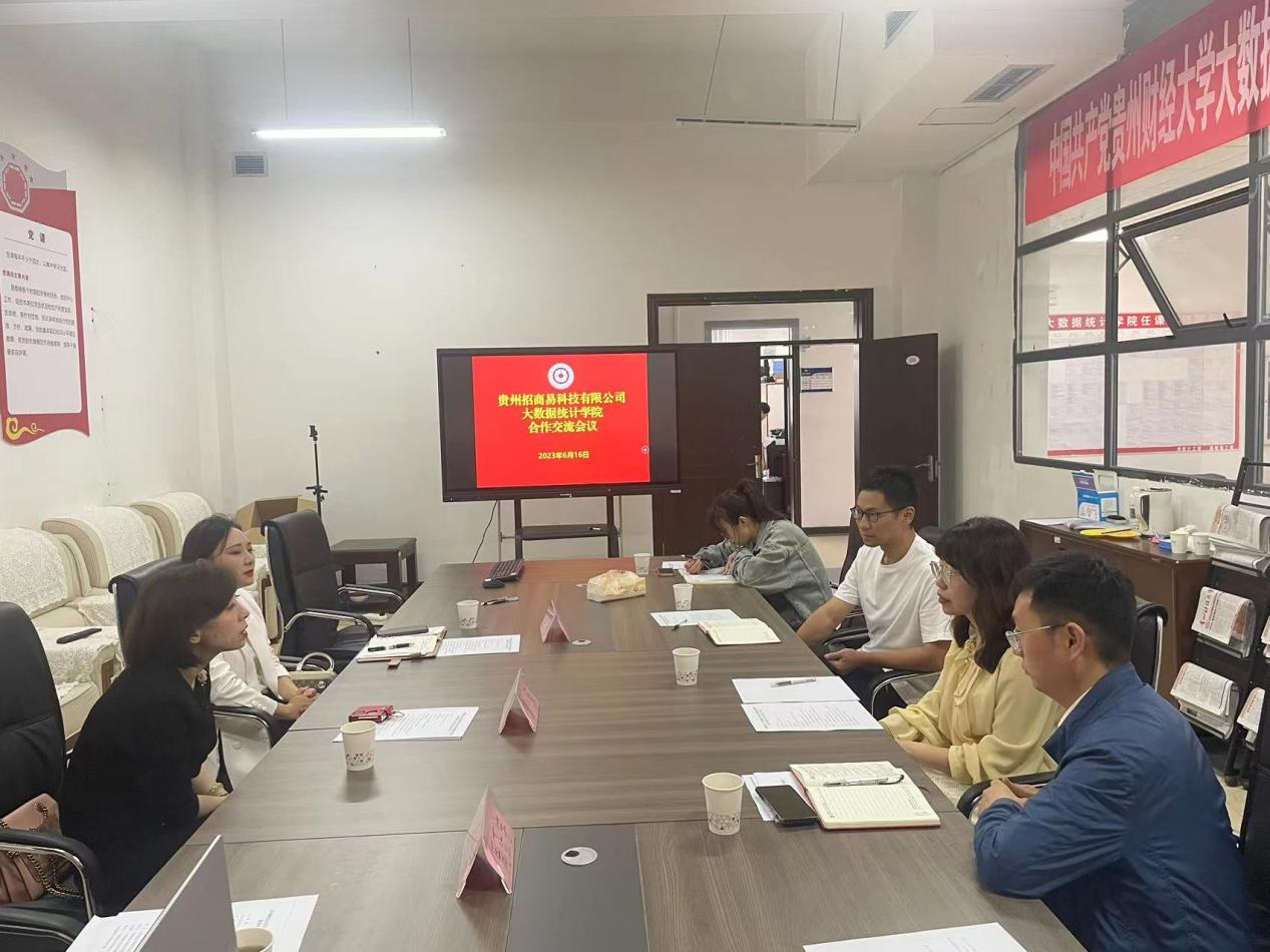 2023年6月16日,贵州招商易科技服务有限公司(以下简称“招商易公司”)执行董事、总经理曹阳、副总经理兰愉带队赴贵州财经大学,就进一步深化双方战略合作与我院开展座谈。学院党委书记鲁静芳、正处级专职组织员陈波、学院党委委员、经济统计学副主任欧阳汉出席,贵州财经学院学科建设负责人、学生工作科辅导员,招商易公司相关负责人参加。
