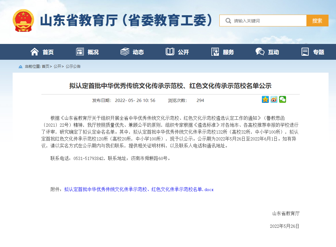 5月26日,山东省教育厅公示“拟认定首批中华优秀传统文化传承示范校、红色文化传承示范校名单”,我校荣登山东省首批中华优秀传统文化传承示范校榜单。