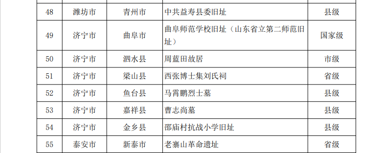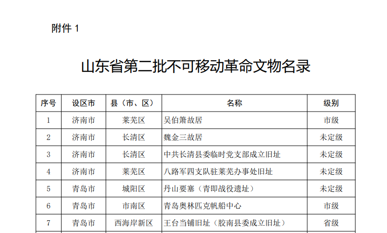山东省文化和旅游厅根据中央宣传部、国家文物局《关于持续开展革命文物名录公布工作的通知》(文物革发〔2022〕13号)要求,组织各市文化和旅游局、省直有关文博单位开展了不可移动革命文物及国有馆藏可移动革命文物申报、筛选核定,并征求省委宣传部、省委党史研究院等部门意见,形成了山东省第二批革命文物名录,其中包括不可移动革命文物143处(其中:全国重点文物保护单位6处、省级文物保护单位13处、市县级文物保护单位105处、一般不可移动文物19处)、可移动革命文物16200件/套。