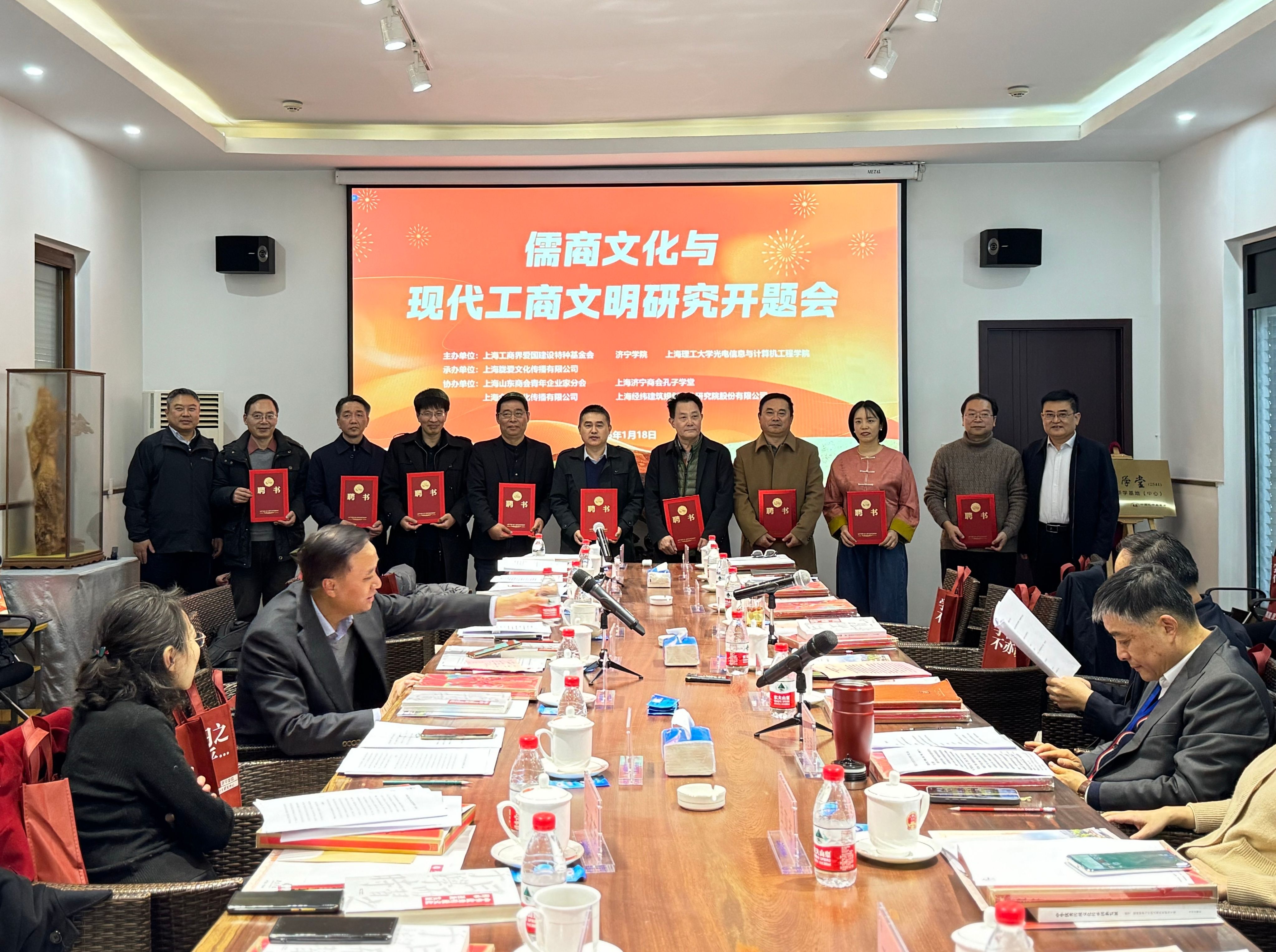 1月18日,“儒商文化与现代工商业文明研究”课题开题会在上海经纬建筑规划设计研究院股份有限公司隆重召开,来自全国各地的专家学者齐聚一堂,共同探讨儒商文化与现代工商业文明的融合与发展,聘任北京大学、中央财经大学、复旦大学、上海交通大学、上海财经大学、山东大学、曲阜师范大学等30位专家为特聘研究专家,并为“儒商文化研究基地”揭牌。我校党委副书记丰家雷出席会议并致辞,济宁市十七届人大常委会副主任陈国华出席并主持会议。上海爱国建设特种基金会理事长、爱建集团党委书记、监事会主席范永进,山东—长三角投融资联盟主席、国信证券股份有限公司原总裁岳克胜,上海经纬建筑规划设计研究院股份有限公司董事长、院长叶松青,中共上海市委党史研究室二级调研员唐旻红等出席会议并发言。