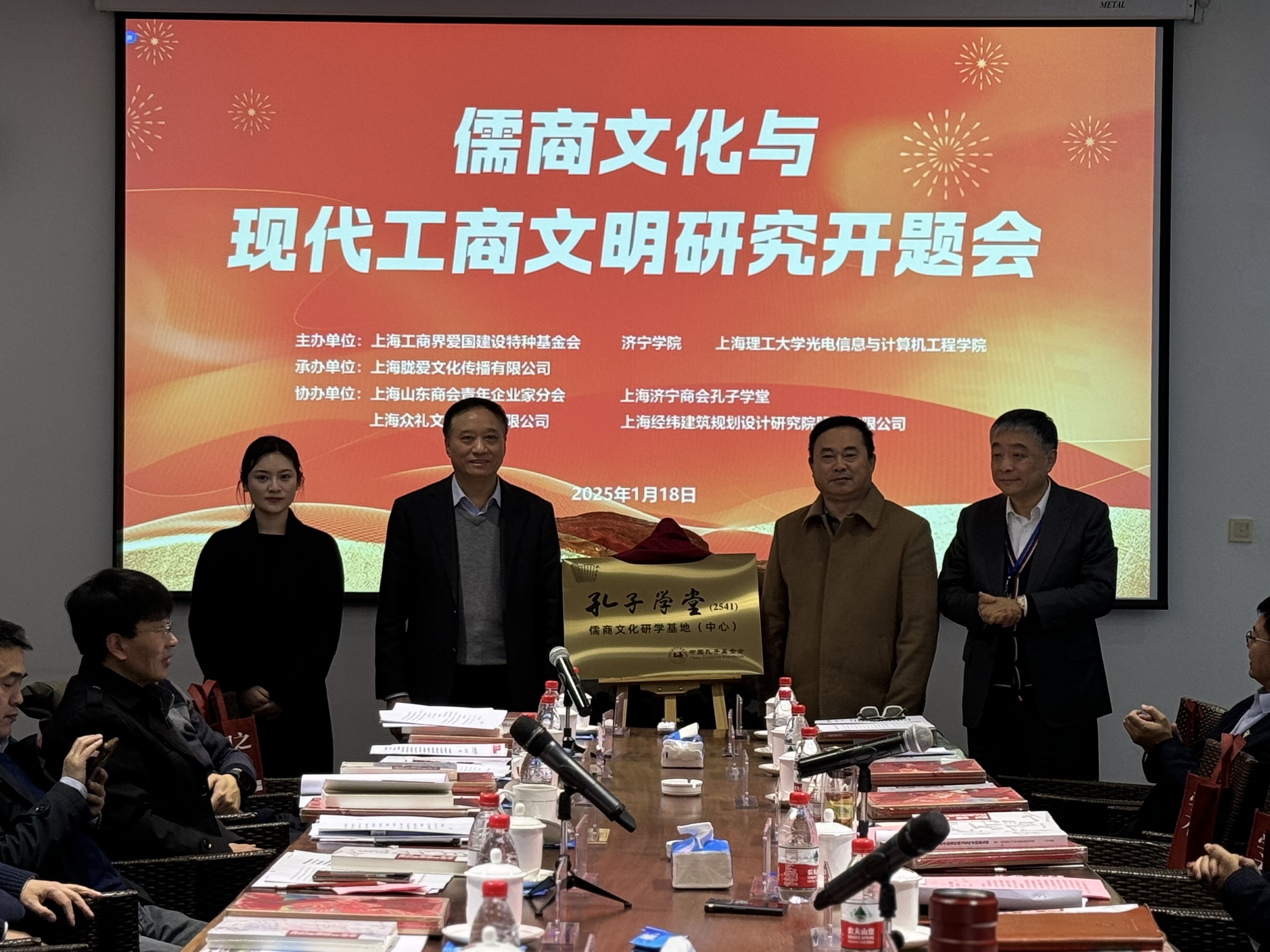 本次会议由上海工商界爱国建设特种基金会、济宁学院、上海理工大学光电信息与计算机工程学院主办,上海胧爱文化传播有限公司承办,上海山东商会青年企业家分会、上海济宁商会孔子学堂、上海众礼文化传播有限公司、上海经纬建筑规划设计研究院股份有限公司等协办。来自上海交通大学、复旦大学、上海财经大学、上海师范大学、上海理工大学、山东体育学院、济宁职业技术学院、衢州市儒商文化促进会、上海交易集团、宜兴市葛盛陶庄文化艺术有限公司等近四十位知名专家学者与企业家参加了此次会议。