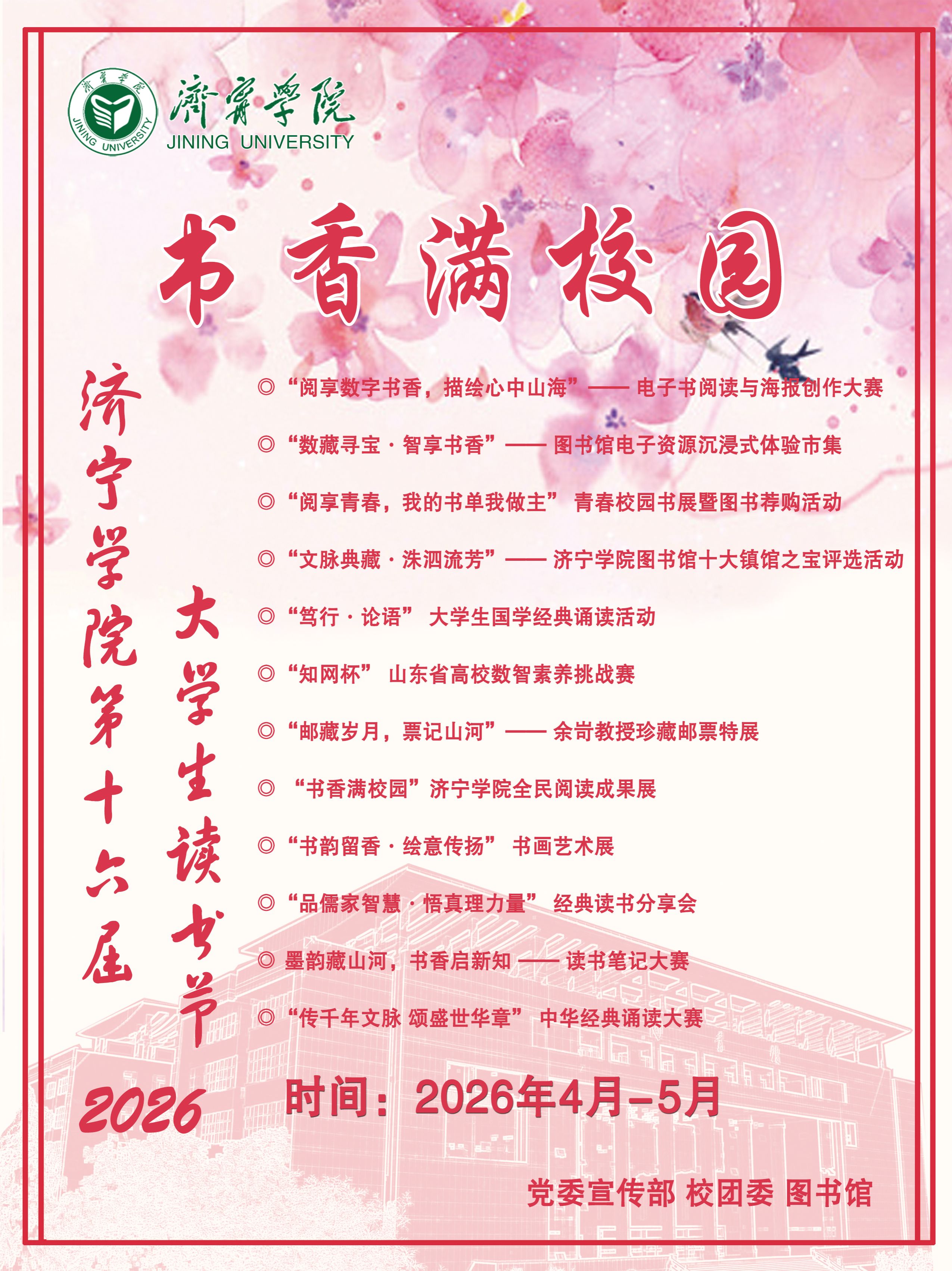 为深入贯彻党的教育方针,落实《全民阅读促进条例》,在第31个“世界读书日”暨首个“全民阅读周”来临之际,济宁学院正式启动“书香满校园”第十六届大学生读书节。活动为期两个月,面向全体在校师生开展“阅享数字书香,描绘心中山海”电子书阅读与海报创作大赛、“数藏寻宝・智享书香”图书馆电子资源沉浸式体验市集、“阅享青春,我的书单我做主”青春校园书展暨图书荐购、“文脉典藏・洙泗流芳”济宁学院图书馆十大镇馆之宝评选等12项特色阅读活动,营造浓郁书香校园文化氛围。