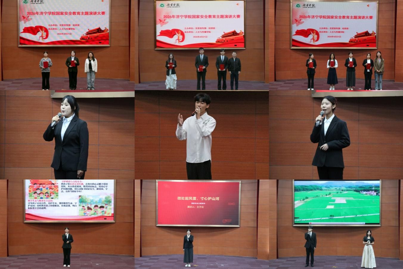 4月21日晚,由学校党委宣传部、团委主办,人文与传播学院承办的“2026年济宁学院国家安全教育主题演讲大赛”决赛在九号楼报告厅举行。党委宣传部、团委、人文与传播学院等单位部门相关负责人出席活动。
