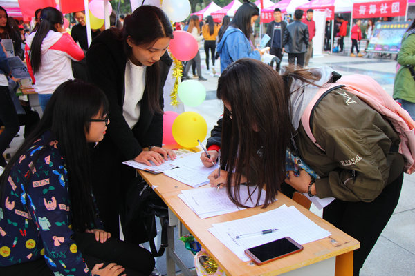 活动现场气氛热烈人头攒动。参与活动的学生社团纷纷使出了“看家本领”,通过展板、海报、宣传册、现场展演、操作实践等别出心裁的纳新创意方式充分展现社团文化特色,着实上演了一场精彩的“百团大战”。活动前期,通过微信、微博等新媒体平台进行宣传,吸引了大批2017级学生前来参加。“知音难觅,社团有你”文化类和学术类社团充满笔墨香气的书画展,让不少同学找到了知己;在公益类和实践类社团内容丰富的展板前,来往的新生纷纷驻足观看,根据自己的兴趣爱好,寻找适合自己的社团;科技类社团独具特色的展示吸引着同学们的视线;艺术类、体育类社团精彩的现场表演和炫酷的技艺展示更是一度将现场氛围推向高潮。活动现场,工作人员装扮成可爱的熊本熊卡通形象让同学们喜爱不已,大家纷纷前来与其合影留念,热闹非凡的活动现场充满青春的欢声笑语。
