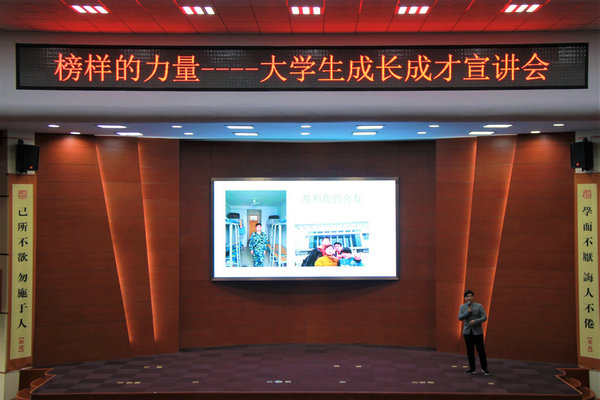 校团委邀请我校第十届“十佳学子”牟栋,“十佳文明大学生”刘雨昕,“十佳创新创业人才”刘鹏宇和朱丰晓四位优秀学生典型作为主讲人,以他们的成长成才的经历对广大青年学生开展学业指导、生活指引、文明修身和创新创业示范。会上,四位同学分别从学习方法的选择,社会实践的心得,创新创业的经历,学生干部的感受等方面与现场同学进行了分享,结合自身经历勉励同学们永怀赤诚之心,努力学习,为青春而奋斗;鼓励大家在大学生活中勇于实践,敢于创新,善于开拓,不断探索。一个个精彩、鲜活、温暖的青春故事榜样们传递了满满的正能量,赢得了全场同学的阵阵掌声。互动环节,同学们踊跃提问,主讲人热心答疑解惑,为2017级新生刚刚开启的大学生活带来贴心的指导和美好的祝福。